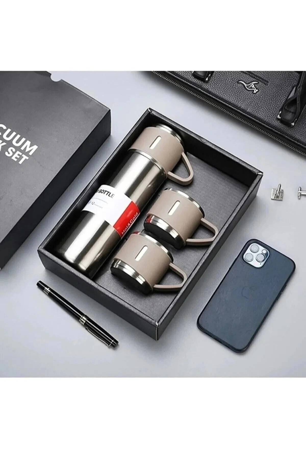 Stanlies Vacuum Flask Set Üç Bardaklı Kutulu Seti Krem/ Gümüş